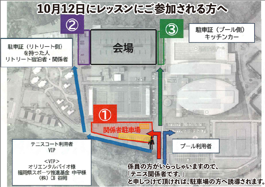 その際に、「どの様な関係の方ですか?」と尋ねられると思いますので、「テニス関係者です。」とお答え頂けると、駐車場の方へ誘導されます。